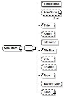 | source | <xs:element name="Item" maxOccurs="unbounded"> <xs:complexType> <xs:sequence> <xs:element name="TimeStamp" type="xs:dateTime"/> <xs:element name="AlsoSeen" type="type_AlsoSeen" minOccurs="0" maxOccurs="unbounded"/> <xs:element name="Title" type="xs:string" minOccurs="0"/> <xs:element name="Artist" type="xs:string" minOccurs="0"/> <xs:element name="FileName"> <xs:simpleType> <xs:restriction base="xs:string"/> </xs:simpleType> </xs:element> <xs:element name="FileSize" type="xs:nonNegativeInteger" minOccurs="0"/> <xs:element name="URL" type="xs:anyURI" minOccurs="0"/> <xs:element name="Type" type="xs:string" minOccurs="0"/> <xs:element name="ExplicitType" type="type_ExplicitType" minOccurs="0"/> <xs:element name="Hash" type="type_Hash" minOccurs="0"/> <xs:element name="UseNetHeader" type="xs:string" minOccurs="0"/> </xs:sequence> </xs:complexType> </xs:element> |